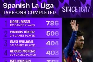 16-17赛季以来西甲过人榜:梅西786次居首,维尼修斯506次第二